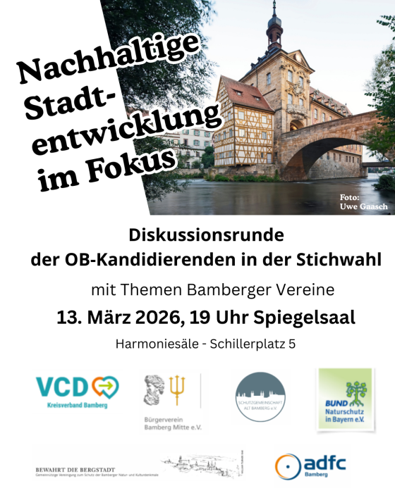 Nachhaltige Stadtentwicklung, moderne Mobilität, lebenswerte Viertel: Beim öffentlichen Diskussionsabend zur OB‑Stichwahl in Bamberg stellen sich die beiden Kandidierenden den Fragen engagierter Bamberger Vereine. Hier weiterlesen ... (ep)